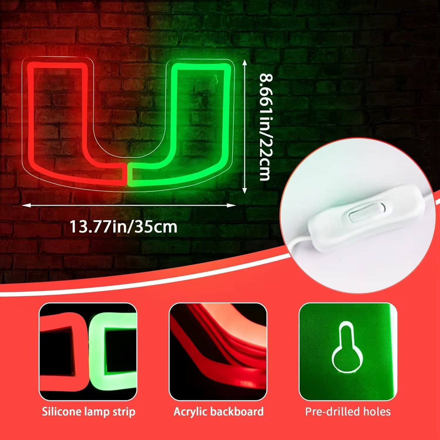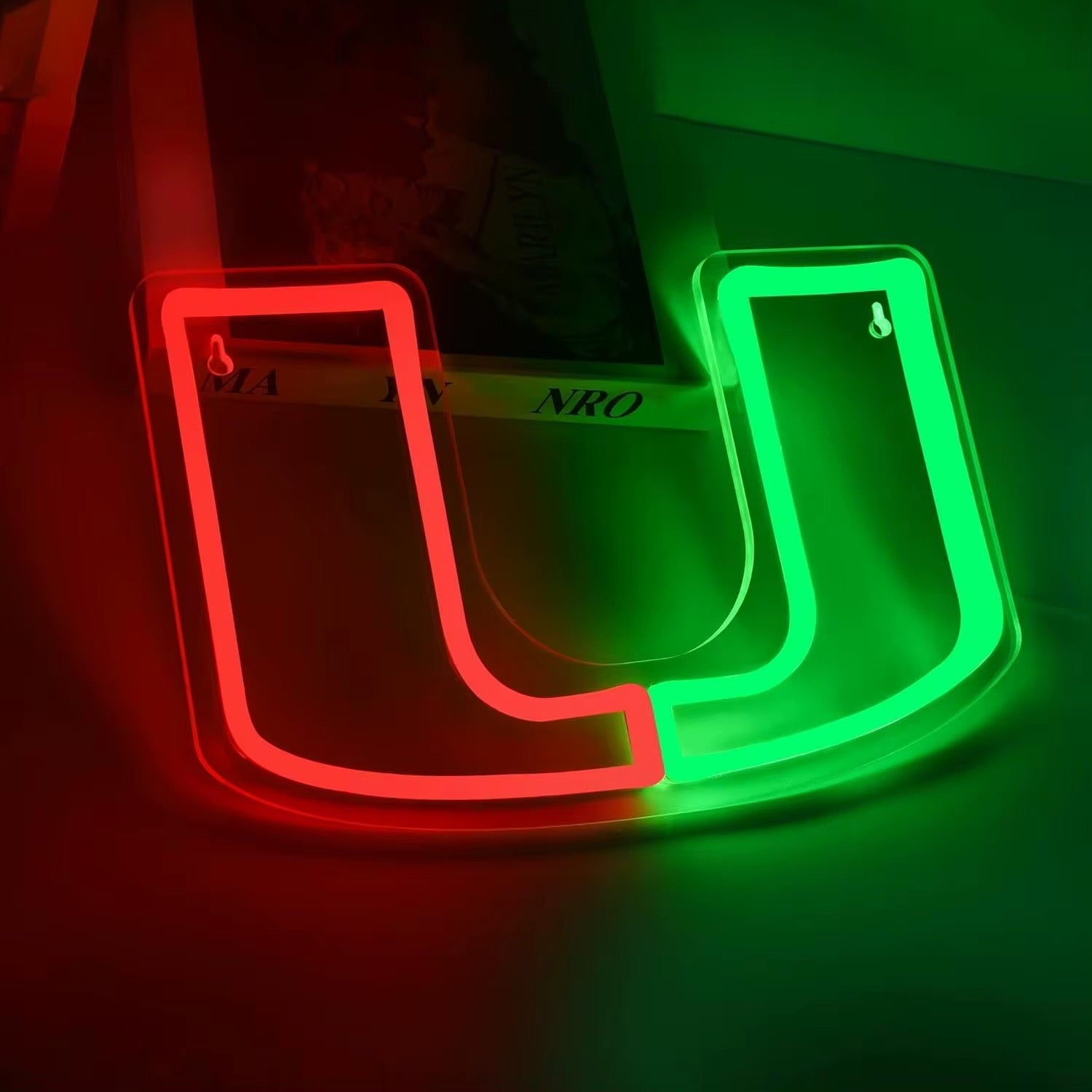 University of Miami neon wall sign. 10W. Red and Green. 8.66in x 13.77in